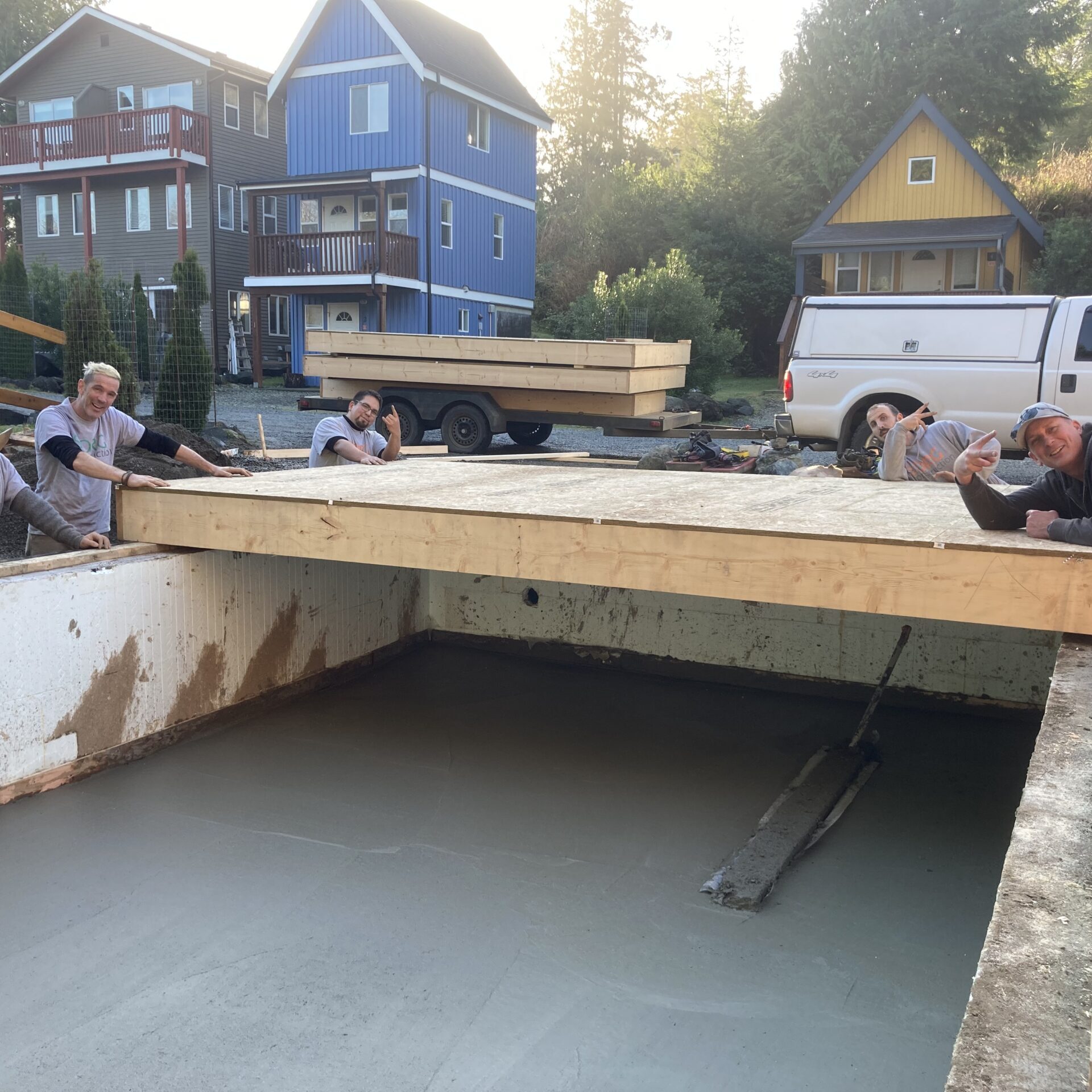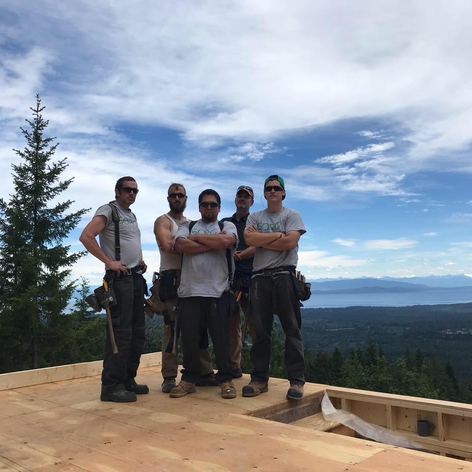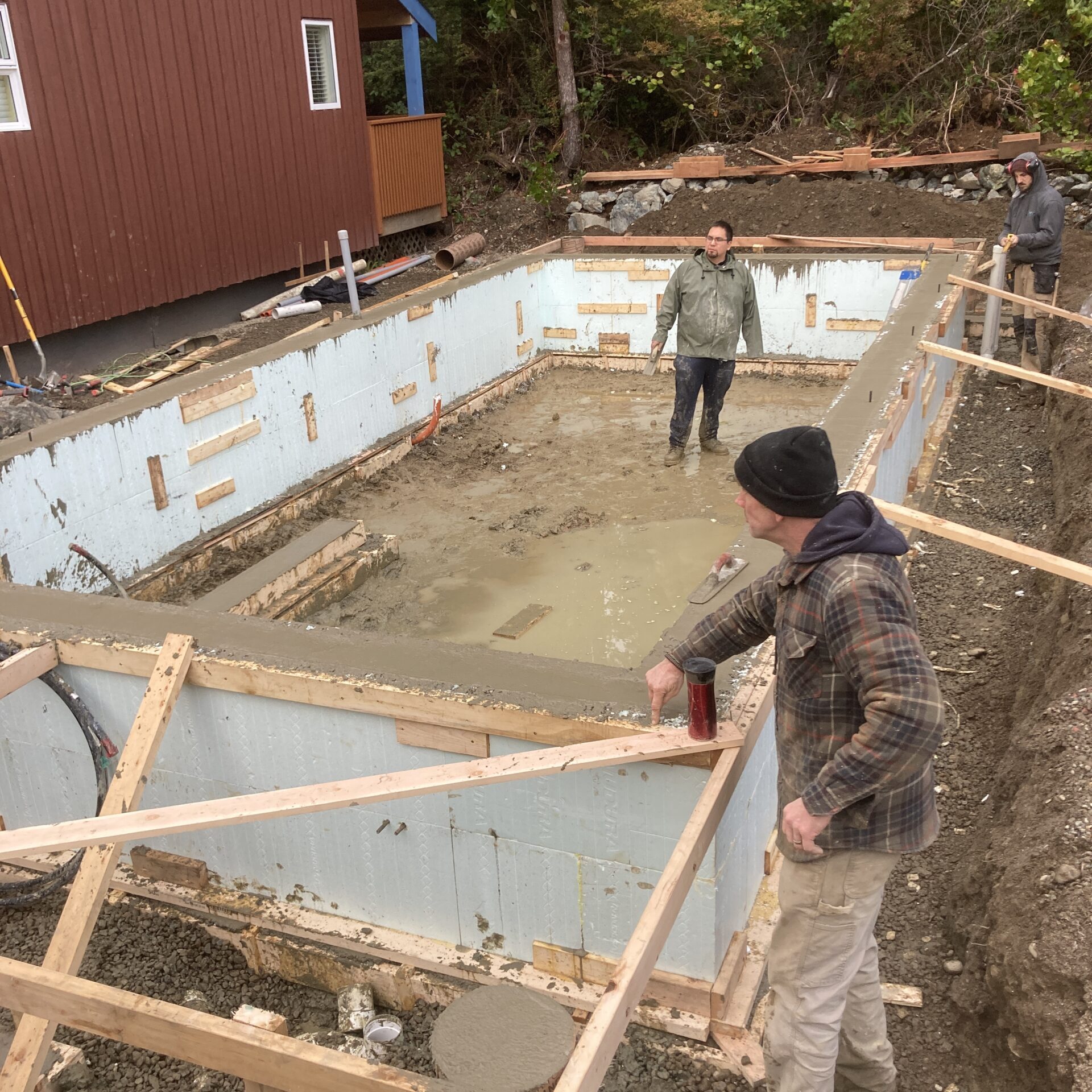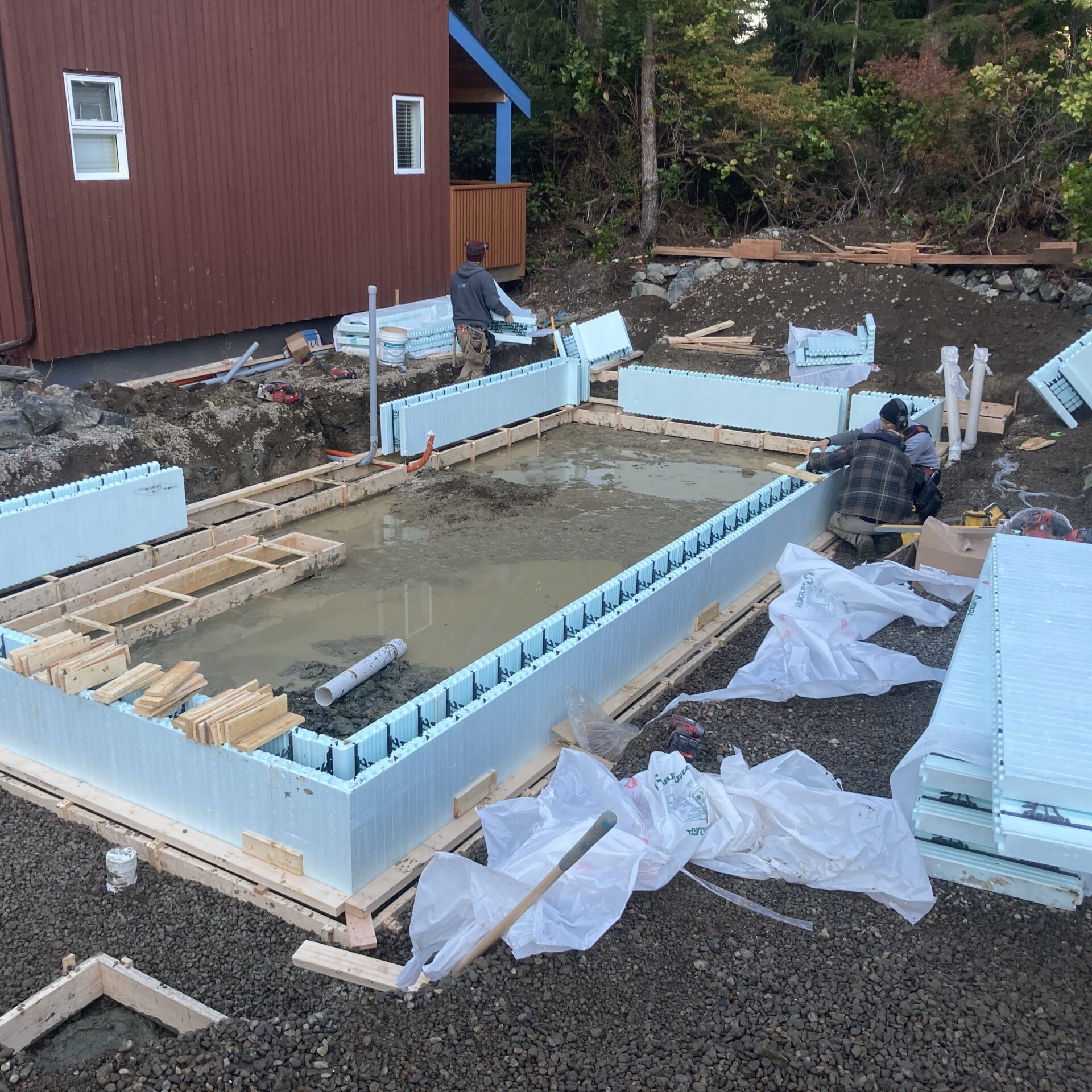 Our crew out on the west coast working on a vacation cottage in Ucluelet. We lucked out with next to no rain for the first trip out there. In 4 days we went from an empty lot with no excavation to a full ICF foundation with water and vapor barriers in place and the ground level floor system installed along with the storm drain. This is a pre-fabricated cottage that we built the walls for in Qualicum Beach and then trucked out to Ukee for final assembly.